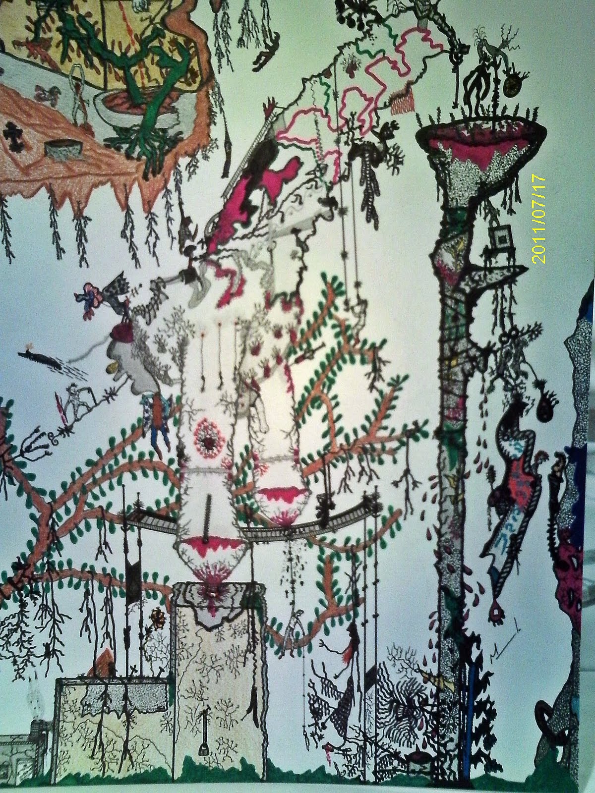 moléculas ziguezagueando pela arte rompem o tempo e restauram desejos transreais, viajam sem direção preestabelecida com a vida. tentáculos delirantes são braços que se estendem sobre intensas variantes rizomáticas. a história despenca em linha reta e se espalha nos entre. entre linhas, rupturas e lisuras, o homem escorre pelos fatos gozados; entre poder, tirania e sacralização de conceitos perversos, o líquido vem. tudo vira dor, sacrifício em vão, quando não se percebe aquilo que infiltra os entres. o mundo se esgota no pessimismo, e a morte estabelece escalada pressentida para o nonsense; fugaz paixão pós-moderna que define sentimentos inúteis e amordaça cegamente o devir-arte libertária nos extremos da hipocrisia.